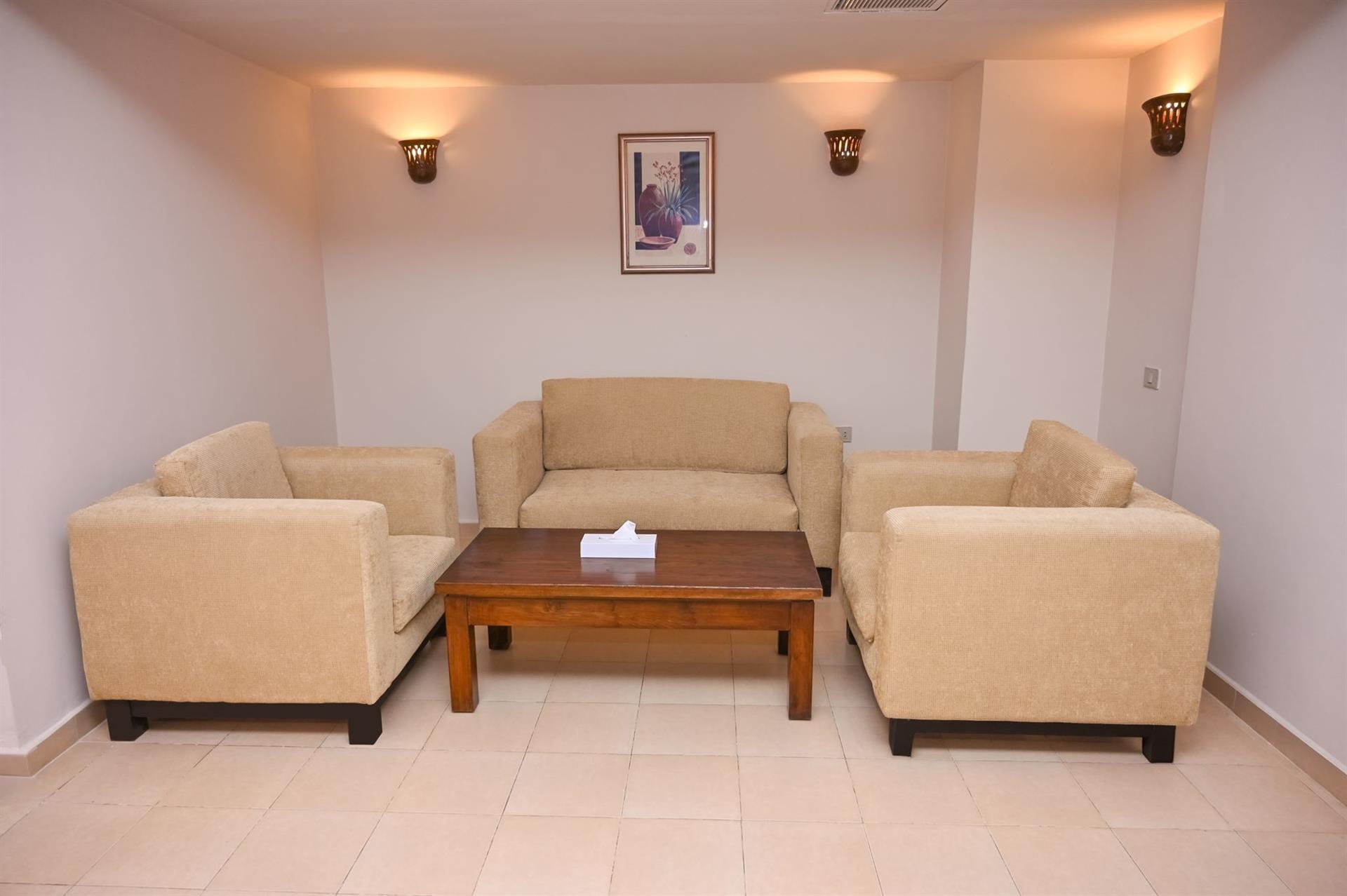 Tuba: 44 m², üks tuba kaheinimesevoodiga (180 cm x 200 cm) või kahe üheinimesevoodiga (120 cm x 200 cm), vannituba, terrass juurdepääsuga ühisele basseinile, basseinivaade.